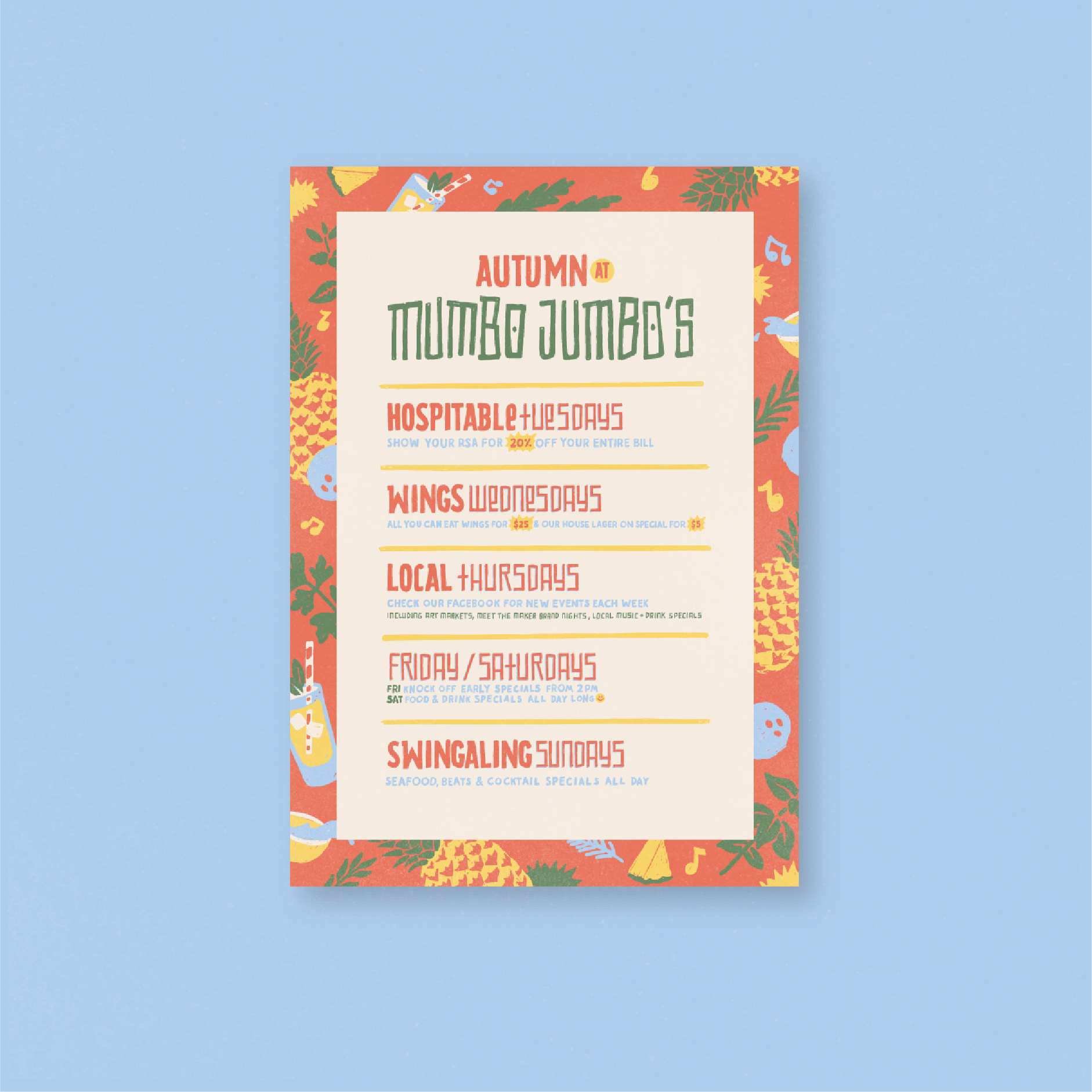 We were lucky enough to work with the now local central Coast (Aus) hotspot; Mumbo jumbos in creating a vibrant, Caribbean inspired branding package. Packed full of bold colours, playful typography and vintage illustrated imagery we provided Mumbo Jumbos with branding assets to really bring their venue and marketing to life, with a soulful and energetic vibe.